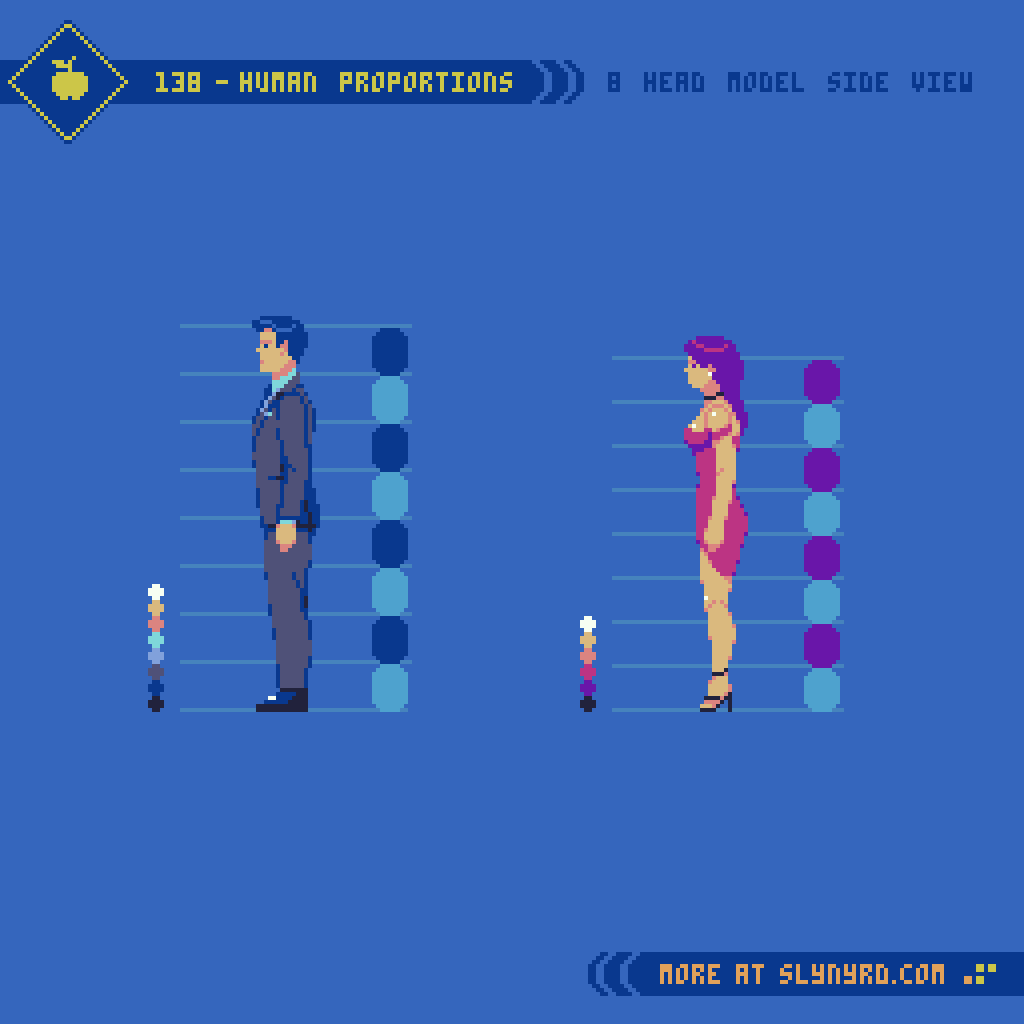 Back in Pixelblog 17, I introduced the 6 head model, which results in relatively stocky, doll-like proportions. Although not completely realistic, this shortened model works well to capture all pertinent details within a small sprite.