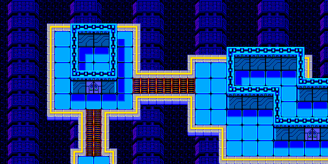 Ah, this cybernetic aesthetic suites the pixels well. Each individual tile is quite simple, but everything comes together in striking fashion. Again, I studied references from PS4 dungeons to inspire the design. The few extra tiles for the baked in shadows is well worth the added depth. The combination of large 32x32px panels along with the standard 16x16px blocks helps break the monotony of the grid. Also the color contrast and different floor textures keeps things interesting. But, the coolest aspect is the parallax background. All done with minimal assets!