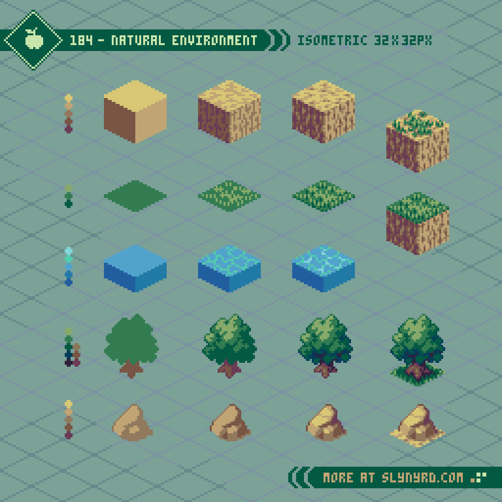 The water tile is about half the height of the standard 32x32px cubes to make it naturally sit lower than the land, and create more interesting geometry to the landscape.